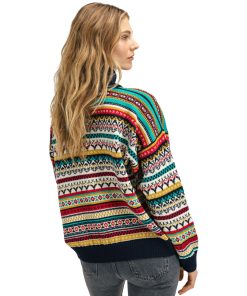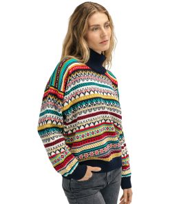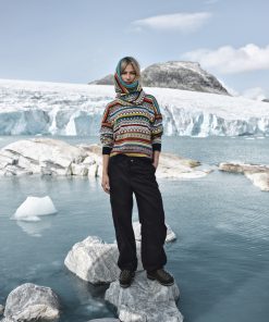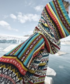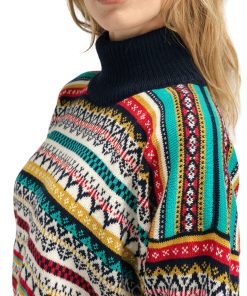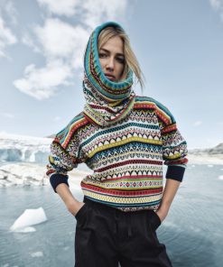 A playful, detailed and fully patterned wool sweater with dropped shoulders and a high neck. Utsira has a wide silhuette with smaller rib endings at the sleeves and hem, giving the sweater a relaxed and oversized fit. The sweater is knitted in 100% longasting wool. The pattern is a mix of historical Dale patterns.